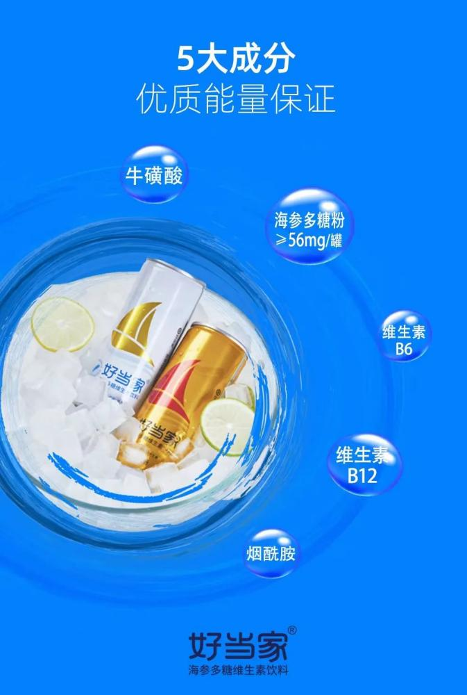每罐好當家·海參多糖維生素飲料含有≥56mg的海參多糖粉,優配牛磺酸+維生素+煙酰胺,不含咖啡因,零脂肪,零蔗糖(無糖白金款),為人們提供優質、健康的能量保障。