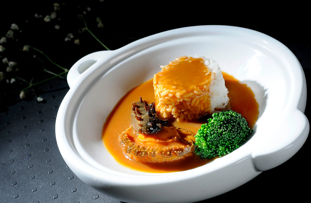 3、翅湯、鮑汁、蠔油、味精和鮑魚原汁放入鍋中燒開加入濕生粉勾芡,澆到海參及米飯上即可。